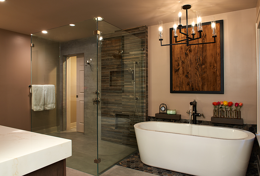 modern bathroom shower wood accent wall